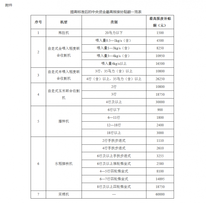 报废20马力以下拖拉机,单台最高报废补贴额由1000元提高到1500元;报废联合收割机、水稻插秧机、播种机并新购置同种类机具,按不超过50%提高报废补贴标准,单台最高报废补贴额不超过3万元;报废并更新购置采棉机,单台最高报废补贴额由3万元提高到6万元(详见附件)。除20马力以下拖拉机外,对只申请报废不新购置的,继续执行《通知》规定的报废补贴标准。对自《通知》印发之日起提交报废补贴申请的,按调整后的报废补贴标准执行,对已领取报废补贴的,补齐差额部分补贴。