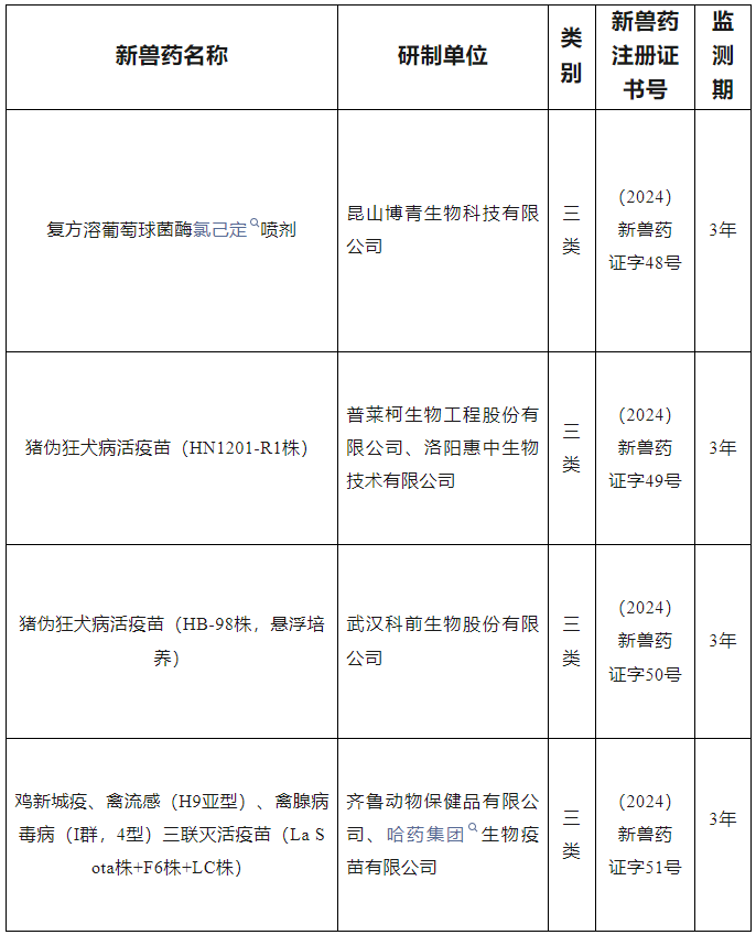 根据《兽药管理条例》和《兽药注册办法》规定,经审查,批准昆山博青生物科技有限公司等6家单位申报的复方溶葡萄球菌酶氯己定喷剂等4种兽药产品为新兽药,核发《新兽药注册证书》,发布产品工艺规程、质量标准、说明书和标签,自发布之日起执行。