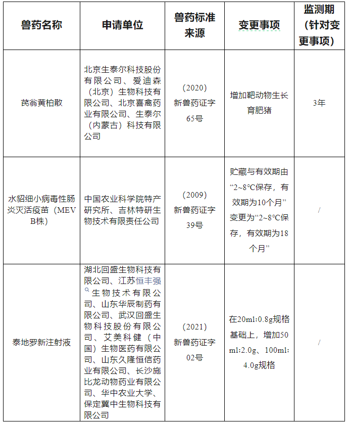 批准北京生泰尔科技股份有限公司等4家单位申报的芪翁黄柏散兽药产品变更注册,发布修订后的说明书和标签,自发布之日起执行;批准中国农业科学院特产研究所等11家单位申报的水貂细小病毒性肠炎灭活疫苗(MEVB株)等2种兽药产品变更注册,申请人按照农业农村部批准的变更事项,自行修改原批准的说明书和标签对应内容,并印制、使用。