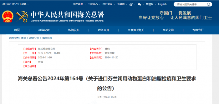 近日,海关总署发布了海关总署公告2024年第164号(关于进口芬兰饲用动物蛋白和油脂检疫和卫生要求的公告)显示,根据我国相关法律法规及中华人民共和国海关总署与芬兰共和国农业与林业部关于芬兰输华饲用动物蛋白和油脂的检疫和卫生要求的规定,即日起,允许符合相关要求的芬兰输华饲用动物蛋白和油脂进口。