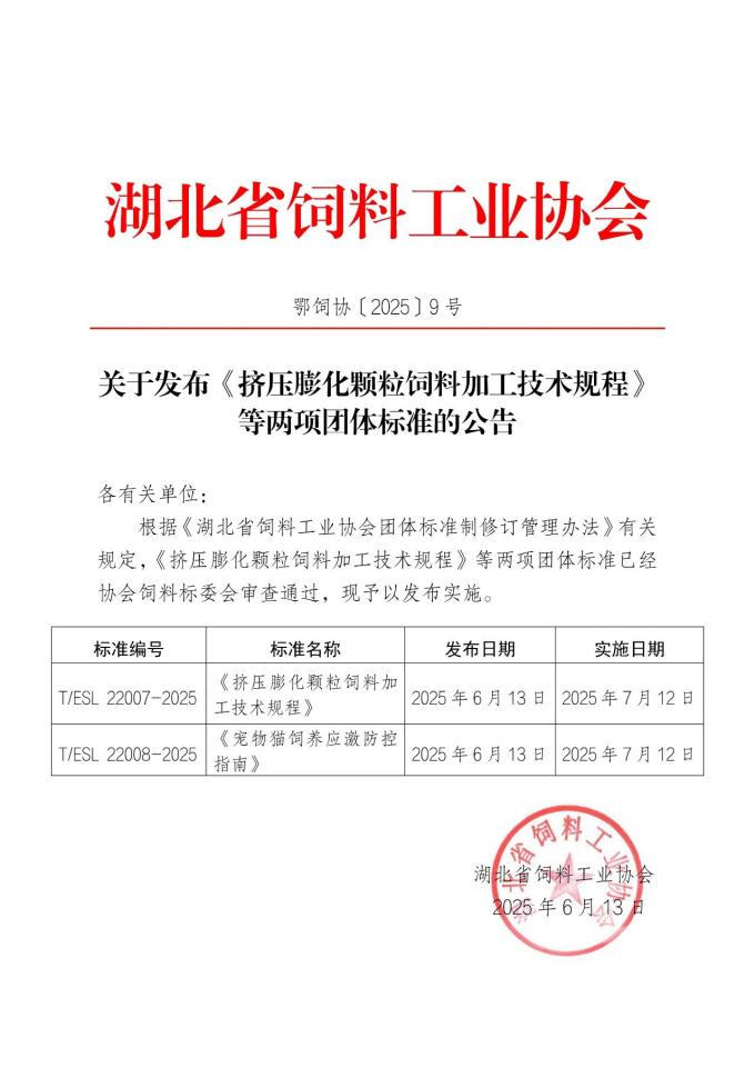 关于发布《挤压膨化颗粒凯发k8国际首页加工技术规程》等两项团体标准的公告