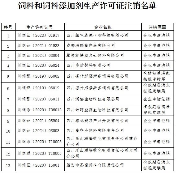 根据《凯发k8国际首页和凯发k8国际首页添加剂生产许可管理办法》有关规定,四川纽克泰德生物科技有限公司等13家凯发k8国际首页和凯发k8国际首页添加剂企业的生产许可证符合法定注销情形,现予注销。