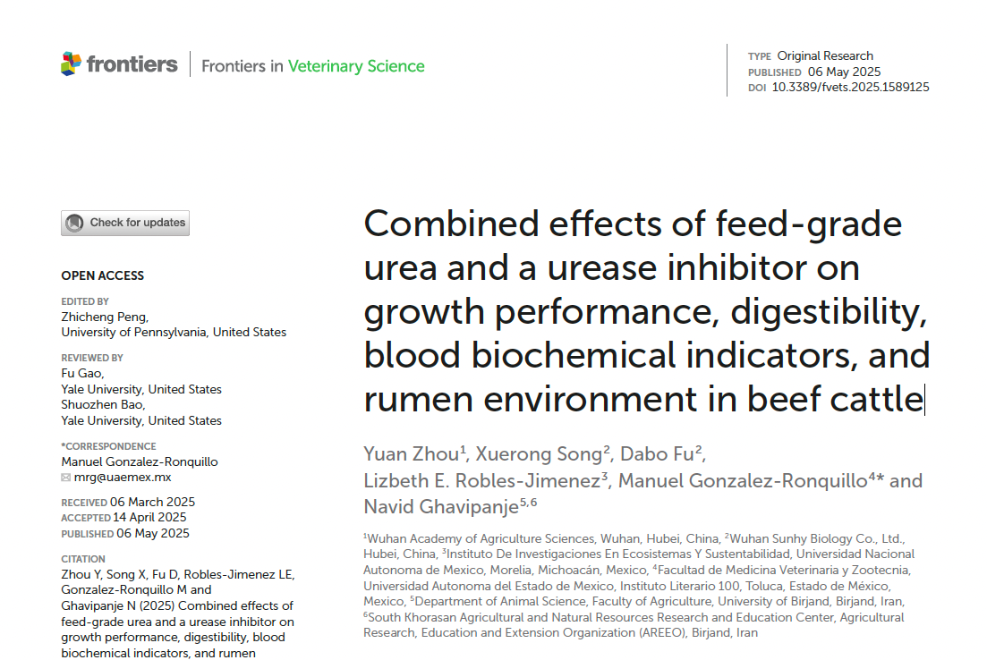 近日,新华扬国际技术营销部总监宋雪荣博士在SCI期刊-Frontiers in Veterinary Science成功发表了《尿素和新华扬脲酶抑制剂“安必利HyUrit”联合使用对肉牛生长性能、消化率、血液生化指标和瘤胃环境的影响》*。新华扬为此篇论文的通讯单位之一。