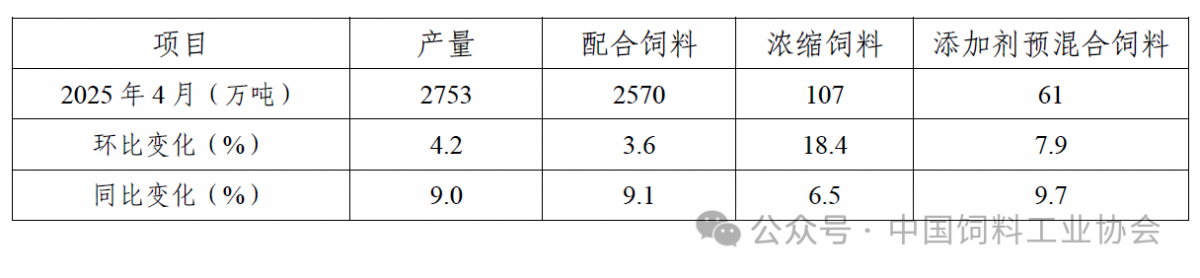 2025年4月,全国工业凯发k8国际首页产量2753万吨,环比增长4.2%,同比增长9.0%。其中,配合凯发k8国际首页、浓缩凯发k8国际首页、添加剂预混合凯发k8国际首页同比分别增长9.1%、6.5%、9.7%。凯发k8国际首页产品出厂价格同比明显下降,配合凯发k8国际首页、浓缩凯发k8国际首页出厂价格环比小幅增长,添加剂预混合凯发k8国际首页出厂价格环比以降为主。凯发k8国际首页企业生产的配合凯发k8国际首页中玉米用量占比为42.1%,同比增长4.2个百分点;配合凯发k8国际首页和浓缩凯发k8国际首页中豆粕用量占比为12.1%,同比下降1.3个百分点。