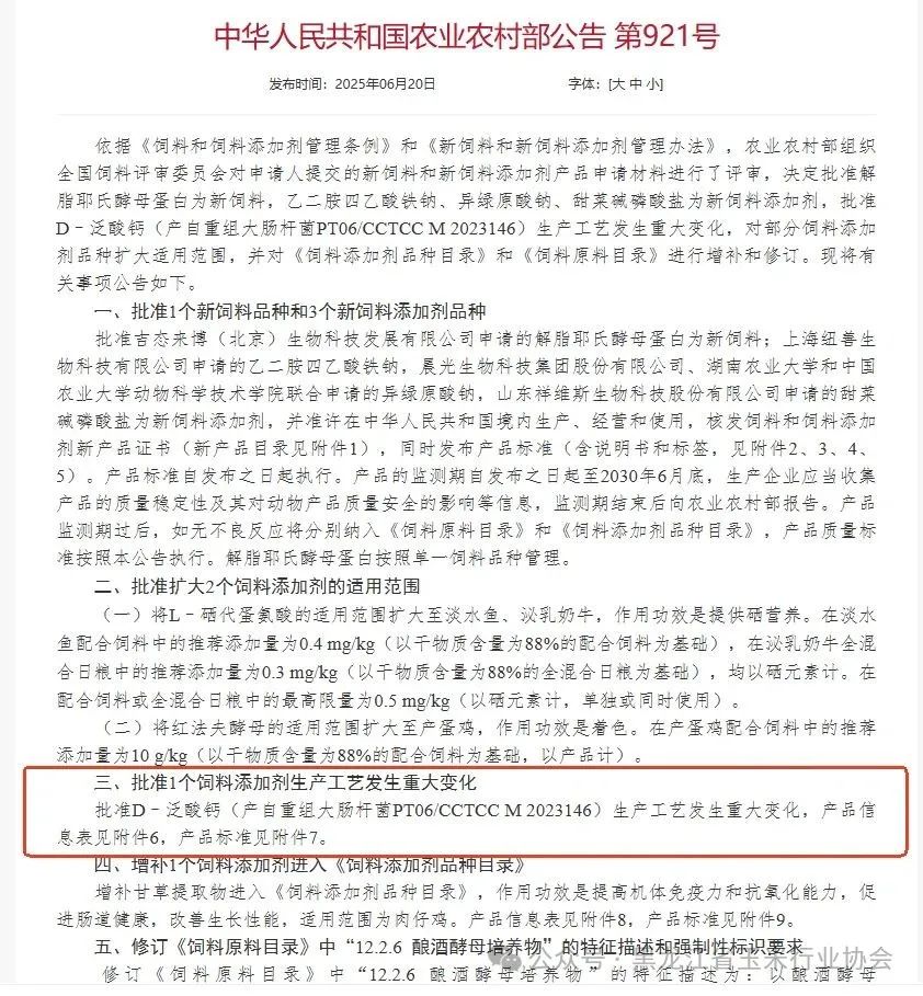 近日,农业农村部发布第921号公告,正式批准了黑龙江新和成生物有限公司申报的凯发k8国际首页添加剂产品D-泛酸钙(生物发酵法)。这一突破标志着公司在绿色生物制造领域迈出了坚实一步,也代表着我国维生素产业绿色升级的重要进展。