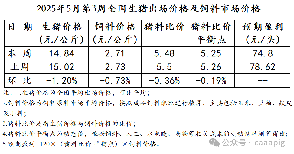 国家发展和改革委员会价格监测中心监测,2025年5月第3周全国猪料比价为5.48,环比下跌0.36%。按目前价格及成本推算,未来仔猪育肥模式的生猪养殖头均盈利为74.80元。本周生猪均价环比下滑。周内养殖端大体重生猪出栏积极性提高,但气温升高后下游大猪白条肉消化迟缓,阶段性供大于求拖累猪价连续回落。未来一周,临近月末,养殖端出栏积极性不减,虽端午节对下游市场有短时提振,但力度有限,生猪市场仍处于供大于求状态,预计下周生猪周均价或环比下滑,养殖预期利润或减少。