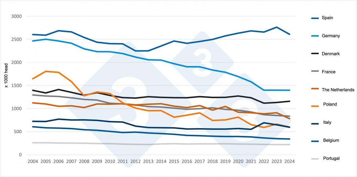 过去二十年,欧盟母猪存栏量下降32%,德国、法国和波兰成为受影响最严重的国家。