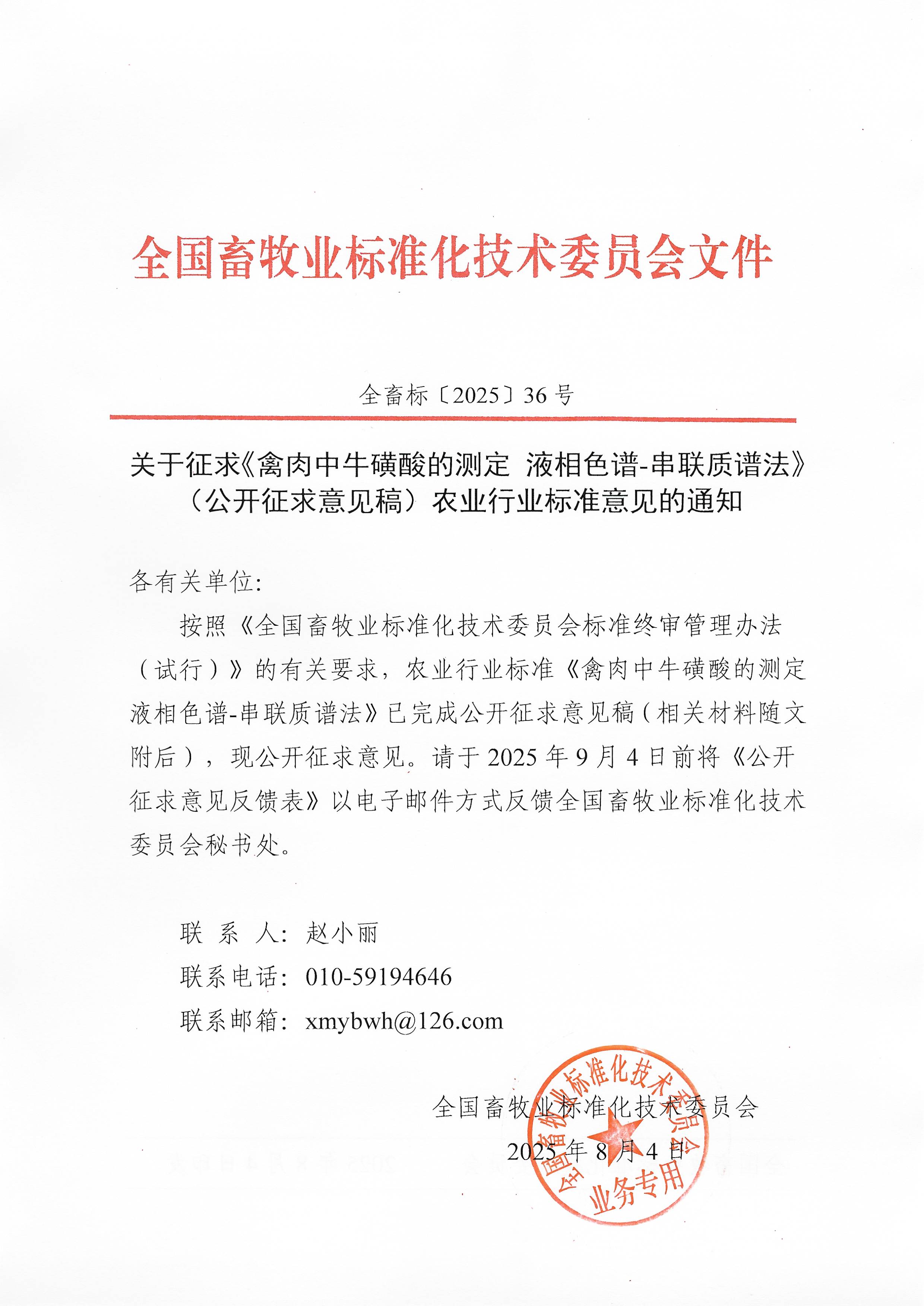 相关附件下载: 1《禽肉中牛磺酸的测定 液相色谱串联质谱法》标准文本-公开征求意见稿.pdf 2《禽肉中牛磺酸的测定 液相色谱串联质谱法》编制说明-公开征求意见稿.pdf 公开征求意见反馈表.docx 关于征求《禽肉中牛磺酸的测定 液相色谱-串联质谱法》(公开征求意见稿)农业行业标准意见的通知.pdf
