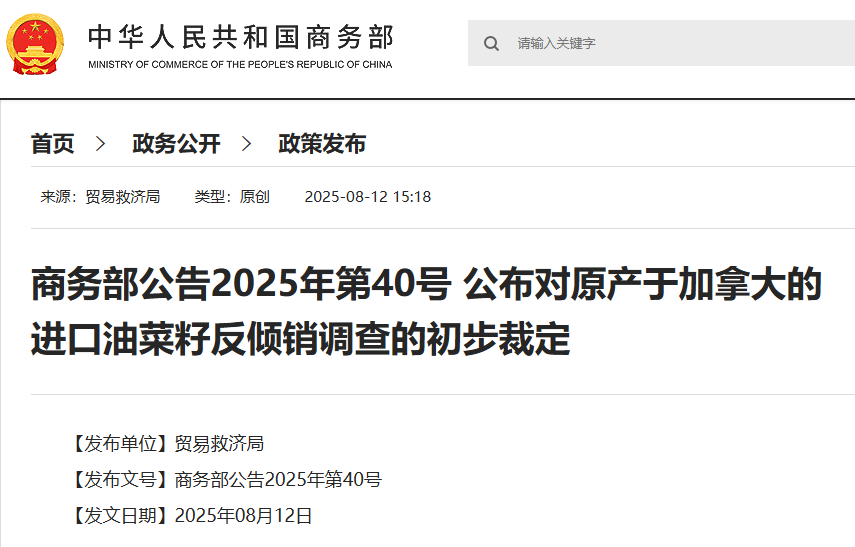 调查机关初步认定,原产于加拿大的进口油菜籽存在倾销,中国国内油菜籽产业受到实质损害,而且倾销与实质损害之间存在因果关系。