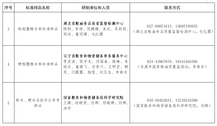 根据《中华人民共和国标准化法》等规定,现发布《籼米加工精度标准样品 精碾》等9项粮食行业标准样品(见附件),自发布之日起施行。 特此公告。 附件:1.粮食行业标准样品目录 2.粮食行业标准样品研制单位 国家粮食和物资储备局 2025年8月15日 (此件公开发布)
