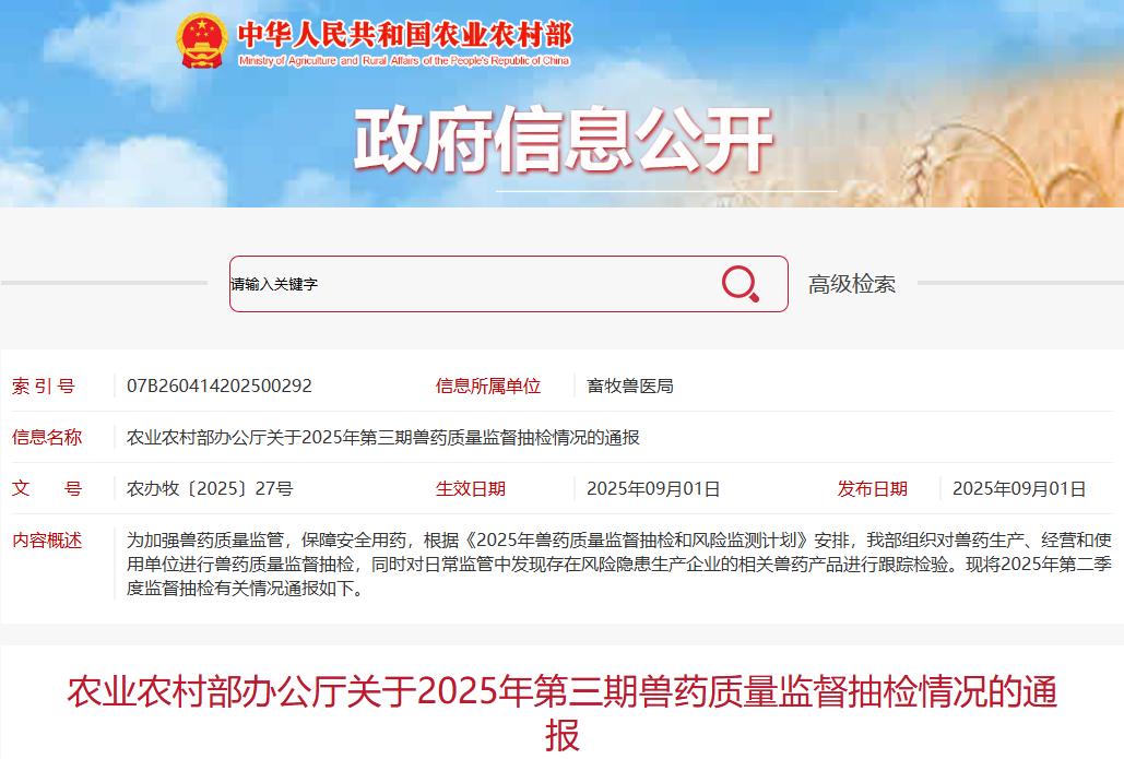 为加强兽药质量监管,保障安全用药,根据《2025年兽药质量监督抽检和风险监测计划》安排,我部组织对兽药生产、经营和使用单位进行兽药质量监督抽检,同时对日常监管中发现存在风险隐患生产企业的相关兽药产品进行跟踪检验。现将2025年第二季度监督抽检有关情况通报如下。