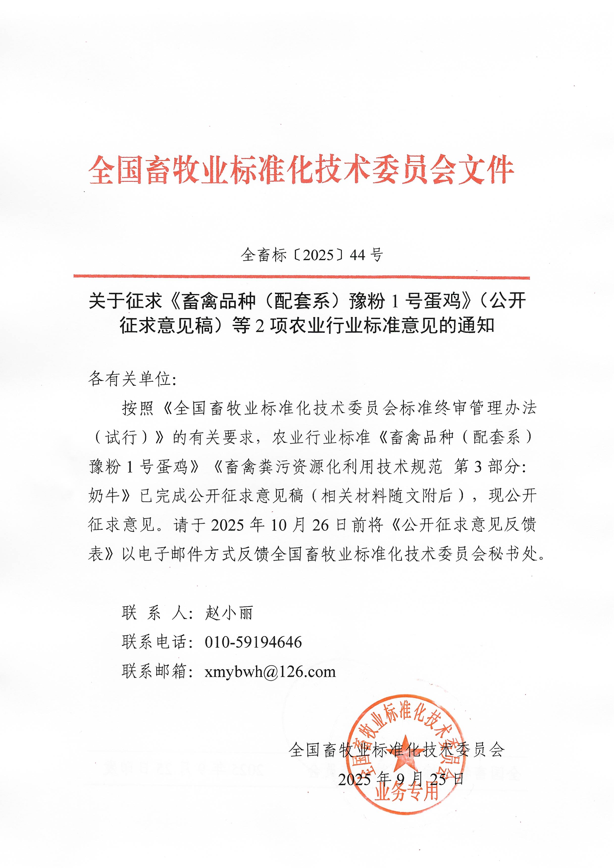 相关附件下载: 1《畜禽品种(配套系) 豫粉1号蛋鸡》标准文本-公开征求意见稿.pdf 2《畜禽品种(配套系) 豫粉1号蛋鸡》编制说明-公开征求意见稿.pdf 3《畜禽粪污资源化利用技术规范 第3部分:奶牛》标准文本-公开征求意见稿.pdf 4《畜禽粪污资源化利用技术规范 第3部分:奶牛》编制说明-公开征求意见稿.pdf 公开征求意见反馈表.docx 关于征求《畜禽品种(配套系) 豫粉1号蛋鸡》(公开征求意见稿)等2项农业行业标准意见的通知.pdf