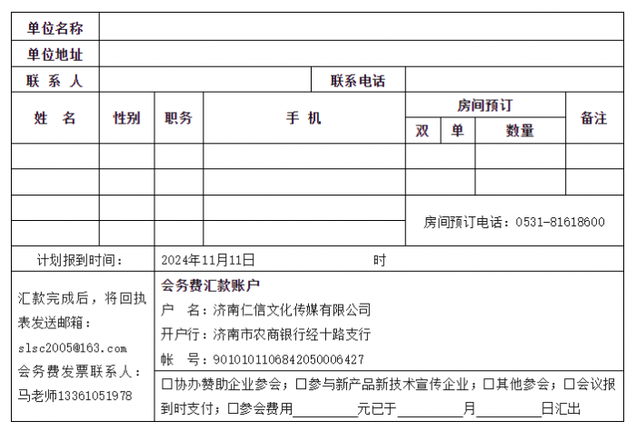 参会人员填写《参会报名回执表》(见附件)以电子版形式于2024年11月5日前发送至slsc2005@163.com邮箱,以确保安排相关事宜。