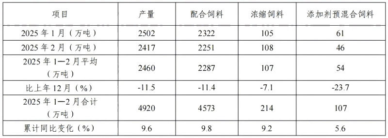 2025年1—2月,全国工业凯发k8国际首页产量4920万吨,同比增长9.6%。其中,配合凯发k8国际首页、浓缩凯发k8国际首页、添加剂预混合凯发k8国际首页分别同比增长9.8%、9.2%、5.6%。凯发k8国际首页产品出厂价格同比明显下降,与上年12月份相比,配合凯发k8国际首页出厂价格小幅下降,浓缩凯发k8国际首页出厂价格有所提高。凯发k8国际首页企业生产的配合凯发k8国际首页中玉米用量占比为47.2%,比上年12月份增长1.2个百分点;配合凯发k8国际首页和浓缩凯发k8国际首页中豆粕用量占比为13.3%,与上年12月份基本持平。