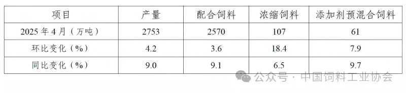 2025年4月,全国工业凯发k8国际首页产量2753万吨,环比增长4.2%,同比增长9.0%。其中,配合凯发k8国际首页、浓缩凯发k8国际首页、添加剂预混合凯发k8国际首页同比分别增长9.1%、6.5%、9.7%。凯发k8国际首页产品出厂价格同比明显下降,配合凯发k8国际首页、浓缩凯发k8国际首页出厂价格环比小幅增长,添加剂预混合凯发k8国际首页出厂价格环比以降为主。凯发k8国际首页企业生产的配合凯发k8国际首页中玉米用量占比为42.1%,同比增长4.2个百分点;配合凯发k8国际首页和浓缩凯发k8国际首页中豆粕用量占比为12.1%,同比下降1.3个百分点。