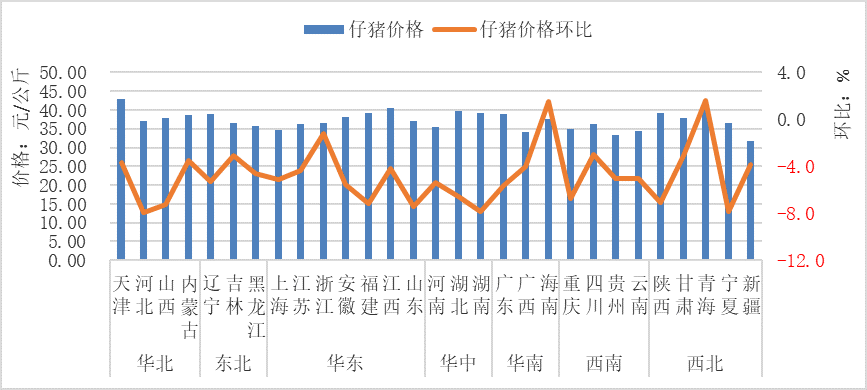 全国仔猪平均价格37.25元/公斤,同比跌14.5%,环比跌4.8%。从价格涨跌情况看,青海、海南2个省份价格上涨,河北、宁夏、湖南、山东、山西等27个省份价格下跌。其中,华中地区环比跌幅较大,湖南领跌,跌幅为7.8%。从价格水平来看,华北地区仔猪平均价格最高,为39.14元/公斤;西南地区最低,为34.79元/公斤。