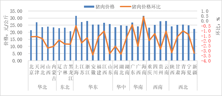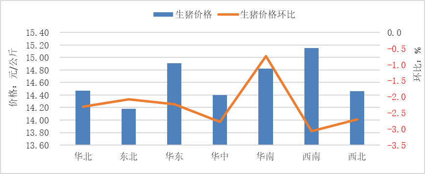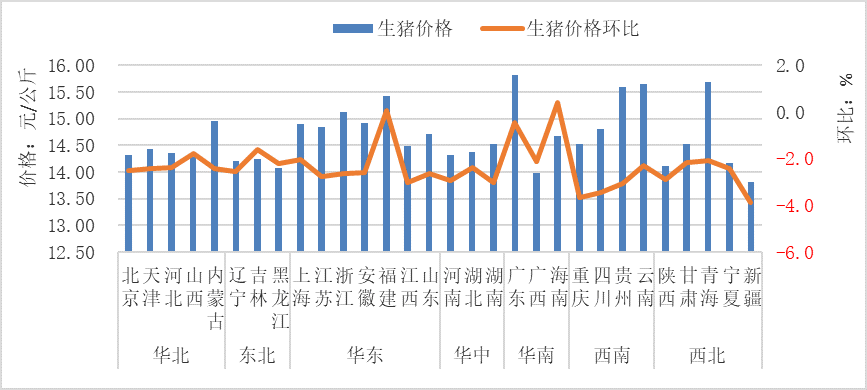 全国生猪平均价格14.66元/公斤,同比跌19.2%,环比跌2.3%。从价格涨跌情况看,海南、福建2个省份价格上涨,新疆、重庆、四川、贵州、江西等28个省份价格下跌。其中,西南地区环比跌幅较大,重庆领跌,跌幅为3.6%。从价格水平来看,西南地区生猪平均价格最高,为15.15元/公斤;东北地区最低,为14.18元/公斤。