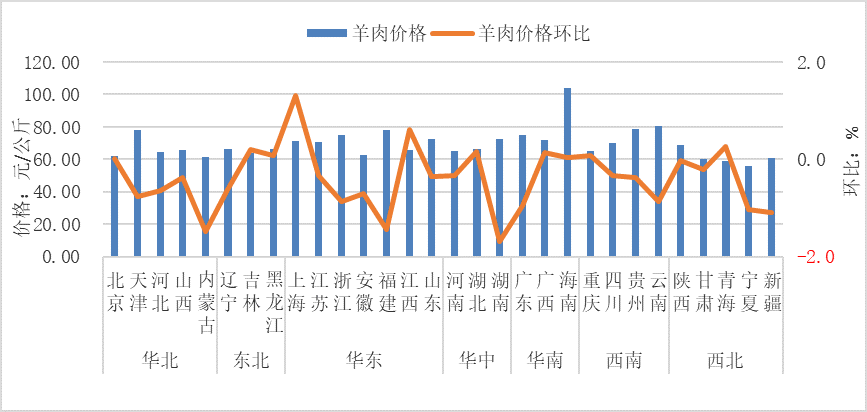 全国羊肉平均价格69.26元/公斤,同比跌2.9%,环比跌0.4%。河北、内蒙古、山东、河南和新疆等主产省份羊肉平均价格67.02元/公斤,同比涨3.6%,环比跌0.8%。从涨跌情况看,华中地区环比跌幅较大,湖南领跌,跌幅为1.7%。