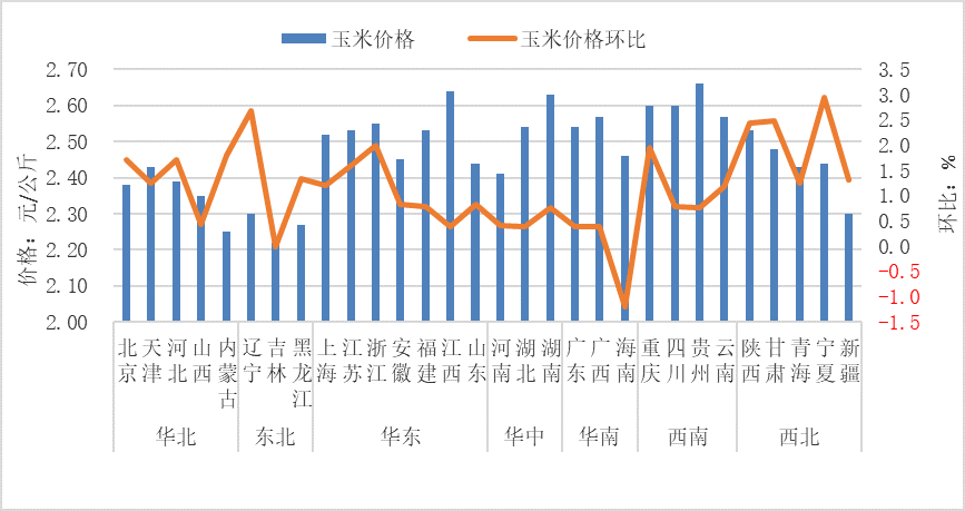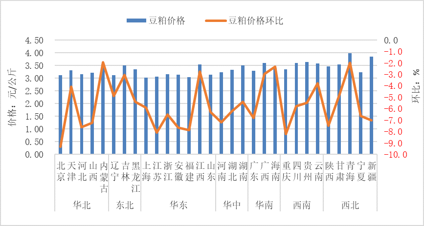全国玉米平均价格2.47元/公斤,同比跌3.9%,环比涨1.2%,主产区东北三省玉米平均价格2.26元/公斤,环比涨1.4%。主销省广东玉米平均价格为2.54元/公斤,环比涨0.4%。全国豆粕平均价格3.37元/公斤,同比跌8.9%,环比跌5.6%。