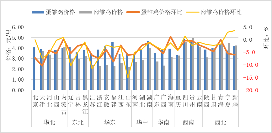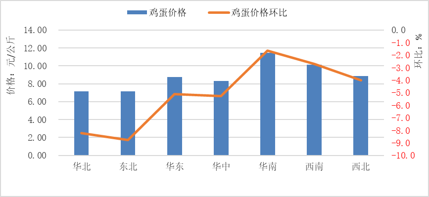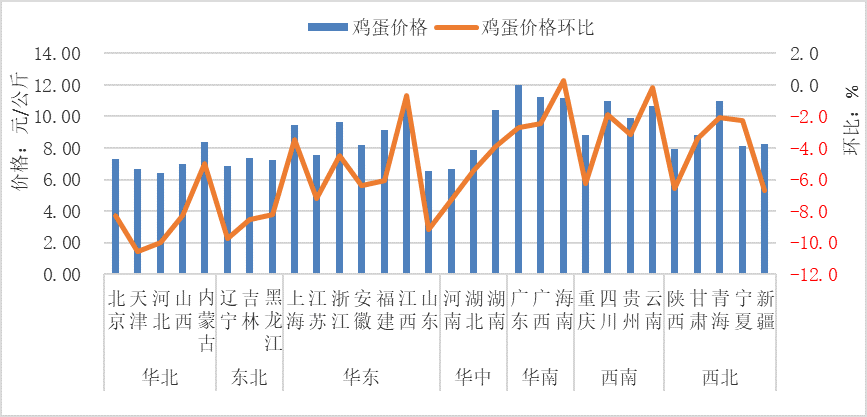 全国鸡蛋平均价格8.74元/公斤,同比跌14.1%,环比跌5.0%。河北、辽宁等10个主产省份鸡蛋平均价格7.18元/公斤,同比跌20.4%,环比跌8.1%。从涨跌情况看,海南价格上涨,天津、河北、辽宁、山东、吉林等29个省份价格下跌。其中,东北地区环比跌幅较大,辽宁领跌,跌幅为9.7%。从价格水平来看,华南地区鸡蛋平均价格最高,为11.47元/公斤;华北地区最低,为7.15元/公斤。