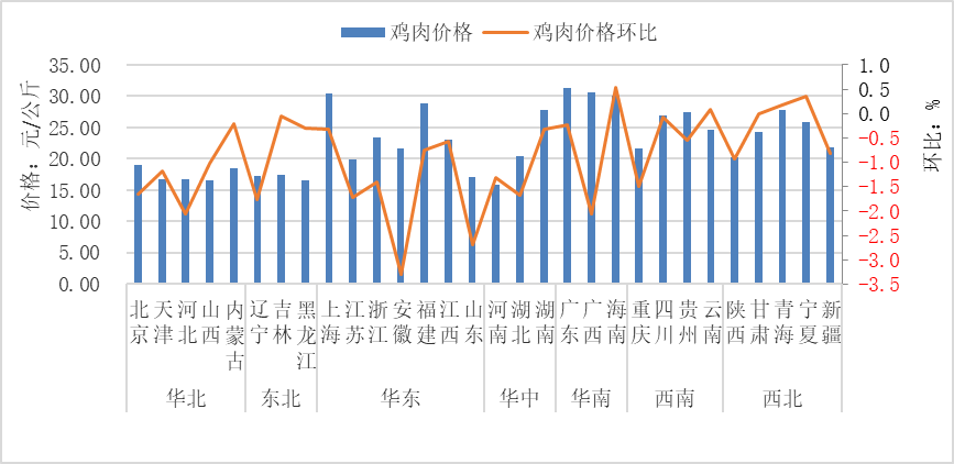 全国鸡肉平均价格22.64元/公斤,同比跌3.7%,环比跌0.8%。从涨跌情况看,海南、宁夏、青海、云南4个省份价格上涨,安徽、山东、广西、河北、辽宁等25个省份价格下跌,甘肃价格持平。华东地区环比跌幅较大,安徽领跌,跌幅为3.3%。