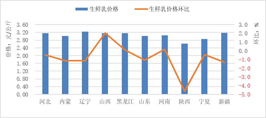 内蒙古、黑龙江等10个主产省份生鲜乳平均价格3.04元/公斤,同比跌7.9%,环比跌1.0%。其中,陕西生鲜乳价格最低,为2.62元/公斤。