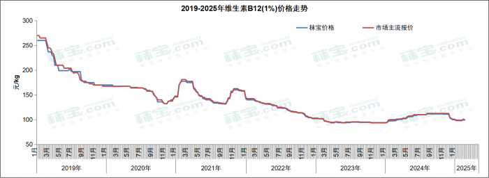 本周维生素B12市场主流价格98-104元/kg。维生素B12有厂家提高报价,不过下游需求疲软,市场价格略有波动后恢复平稳,后续需关注下游库存变化。