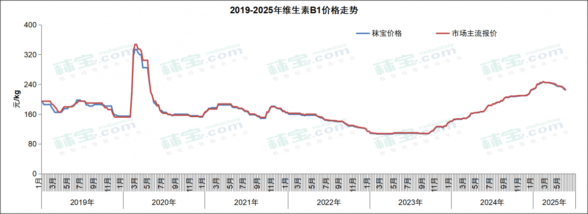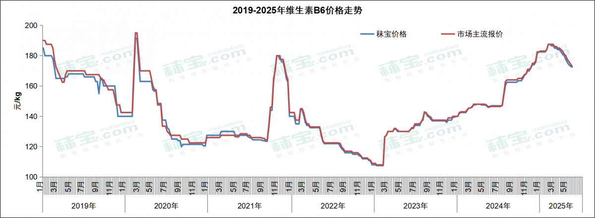 本周维生素B6市场主流价格170-176元/kg。维生素B6市场货源有限,询单相对清淡,贸易市场价格弱稳运行。后续需关注厂家定价策略和市场库存情况,以及新产能供应格局变化。据海关数据统计,2025年4月我国维生素B6出口量约544.53吨,同比降低36%。2025年1-4月我国维生素B6出口量约2651.63吨,同比降低4.91%。