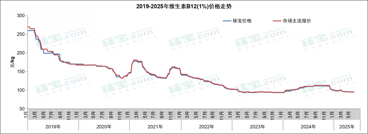 本周维生素B12市场主流价格94-97元/kg。维生素B12下游需求疲软,市场价格调整运行,后续需关注下游库存变化。据海关数据统计,2025年4月我国维生素B12出口量36.87吨,同比降低66.48%。2025年1-4月我国维生素B12出口量约132.05吨,同比降低52.32%。