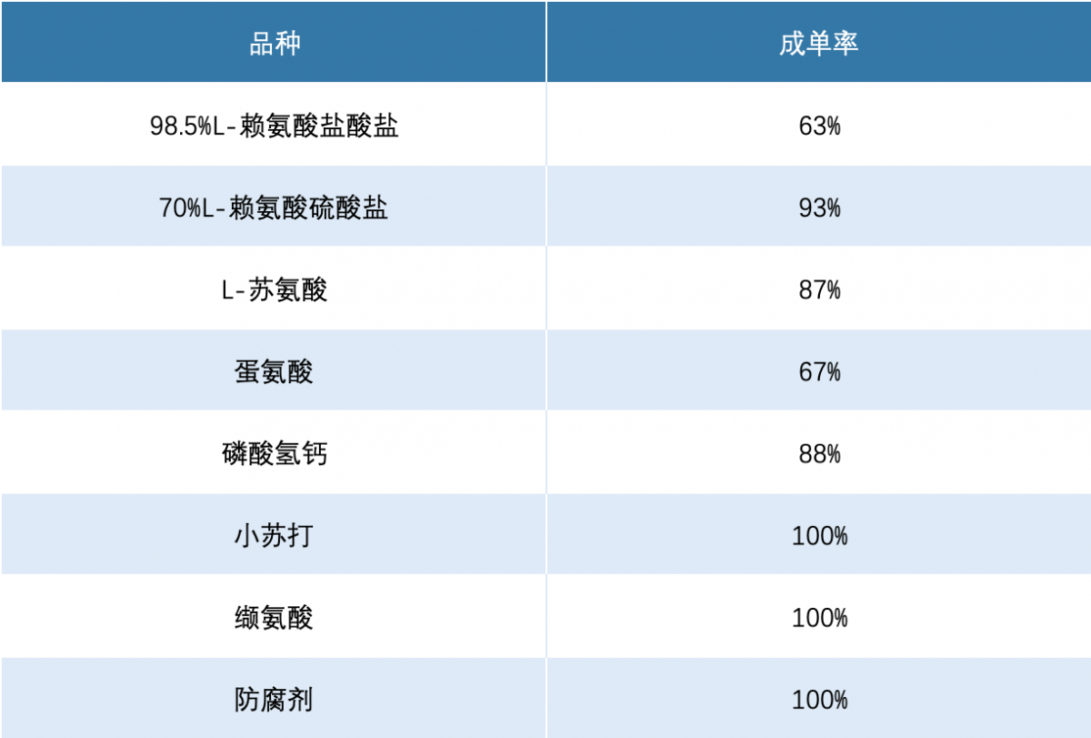 高成单率集中于L-赖氨酸硫酸盐、L-苏氨酸、磷酸氢钙、小苏打等品类,其成单率超70%,反映出刚需品类的市场活跃度。