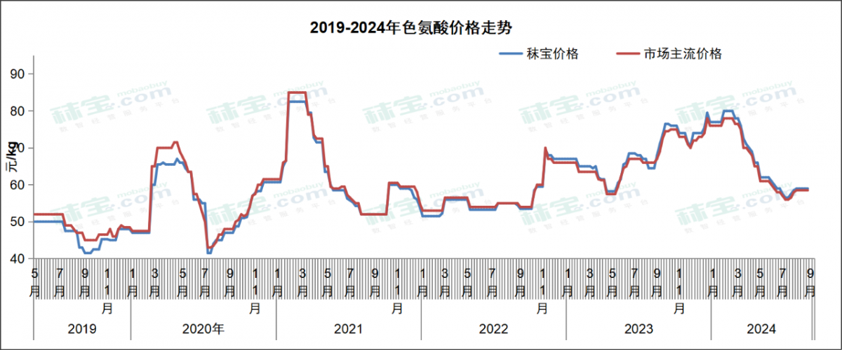 目前国内色氨酸市场主流报价为43.0-45.5元/kg。色氨酸市场主流厂家报价持稳,终端询单成交清淡,谨慎刚需补货。后续需关注厂家报价策略和实际成交情况。预计短期内色氨酸价格稳中调整。