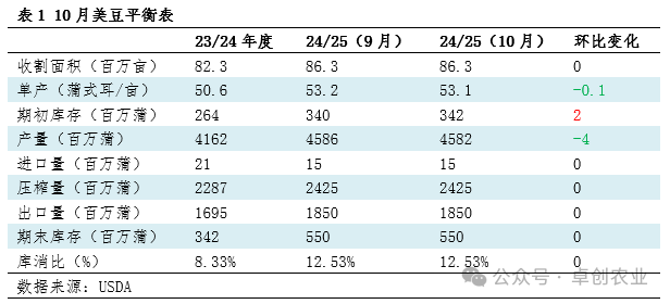 提示:本文为卓创资讯《USDA月度大豆供需报告解读及中国豆粕市场分析》专项报告的一部分内容的节选。卓创资讯目前已上线系列报告:《USDA月度大豆供需报告前瞻及中国豆粕市场展望》、《USDA月度大豆供需报告解读及中国豆粕市场分析》,详情请致电咨询或浏览:https://vip.sci99.com/pages/showreports.html?id=297454&orderid=13根据美国农业部24/25年度的供需平衡表数据显示,10月平衡表的库销比为12.53%,环比稳定。整体平衡表环比稳定,部分项目零星调整,单产的小幅下调,对供需大局影响有限,期末库存为5.5亿蒲式耳环比稳定,因此平衡表影响中性。