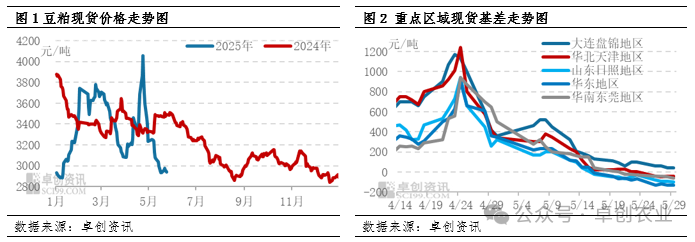 根据卓创资讯数据监测显示,自4月下旬以来,现货价格进入下跌通道,从高点4060元/吨,跌至5月29日的2918元/吨,累积下跌1142元/吨,跌幅28.13%。逐步接近年初价格低点2884元/吨。从现货基差走势来看,截至5月29日,华东地区现货基差跌至负130元/吨,成为区域最低价。5月上旬,豆粕期货M09价格逐步企稳,并在下旬逐步走出了偏强态势,市场对于M09合约分歧较大,空头逻辑主要集中在近月的压力尚未明显释放,而多头逻辑在于工厂对9月及以后的原料采购处于空窗期,对未来市场供应存担忧情绪。多空持续博弈导致期现货走势出现分化,豆粕现货基差快速挤压,未来仍有进一步下跌空间。