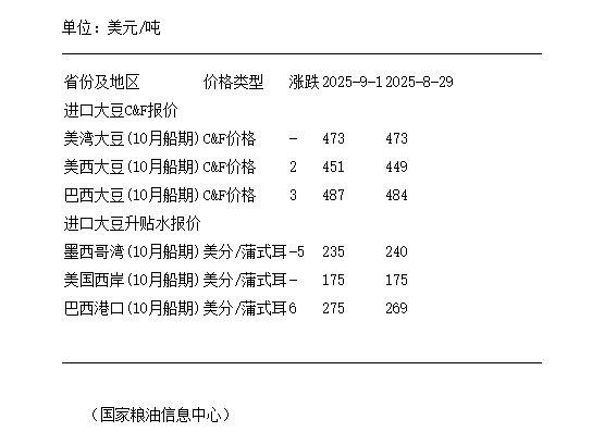 9月1日进口大豆到国内港口C&F及升贴水报价