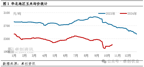 截至10月18日,华北地区玉米均价涨至2120.71元/吨,较去年同期低22.00%,较9月底涨109.29元/吨,累计涨5.43%。