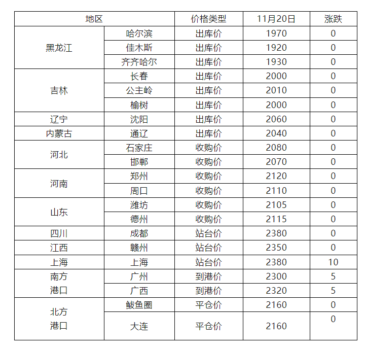 玉米价格最新行情报价(仅供参考): 山东潍坊盛泰药业:下调5厘,玉米收购价格1.057元/斤 山东潍坊健宝生物:下调5厘,玉米收购价格1.085元/斤 山东临沂鲁洲集团:下调5厘,现金收购价格1.071元/斤,循环玉米收购价格1.078元/斤。 河北宁晋玉锋集团:下调5厘-1分,一区玉米收购价格1.025元/斤,二四区玉米收购价格1.03元/斤。 河北衡水中粮生化:上调1分,玉米三等15.5水内收购价格1.035元/斤,15.5水以上收购价格1.025元/斤。 安徽宿州萧县金玉米:上调5厘,玉米收购价格1.12元/斤。 河南驻马店金玉锋:下调5厘,玉米收购价格1.125元/斤,带票1.13元/斤。 吉林中粮农安库:下调,玉米25水收购价格0.858元/斤,30水收购价格0.792元/斤,锦州港今早主流收购15水700容重2100元/斤,上调5-10元/斤/吨。 黑龙江大庆伊品:下调5厘,玉米三等14水收购价格0.975元/斤、30水收购价格0.7878元/斤。 黑龙江中储粮宾县直属库:下调5厘,玉米收购价格1.03元/斤。 新疆沂利泓生物:上调2毛,玉米650容重14水收购价格0.915元/斤。