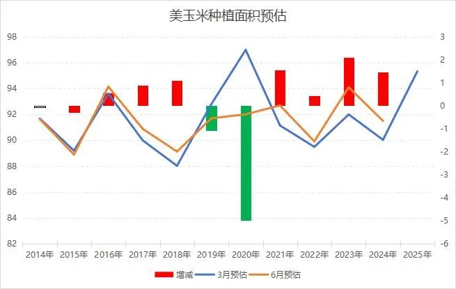 影响美玉米的两大重要报告,在北京时间昨日凌晨相继出炉,“悲喜交加”的结果令CBOT玉米在昨晚如坐过山车。美国农业部发布报告显示,美国2025年玉米种植面积预估为9532.6万英亩,高于市场此前预估的9436.1万英亩,比2024年实际种植面积9059.4万英亩增加5.22%。