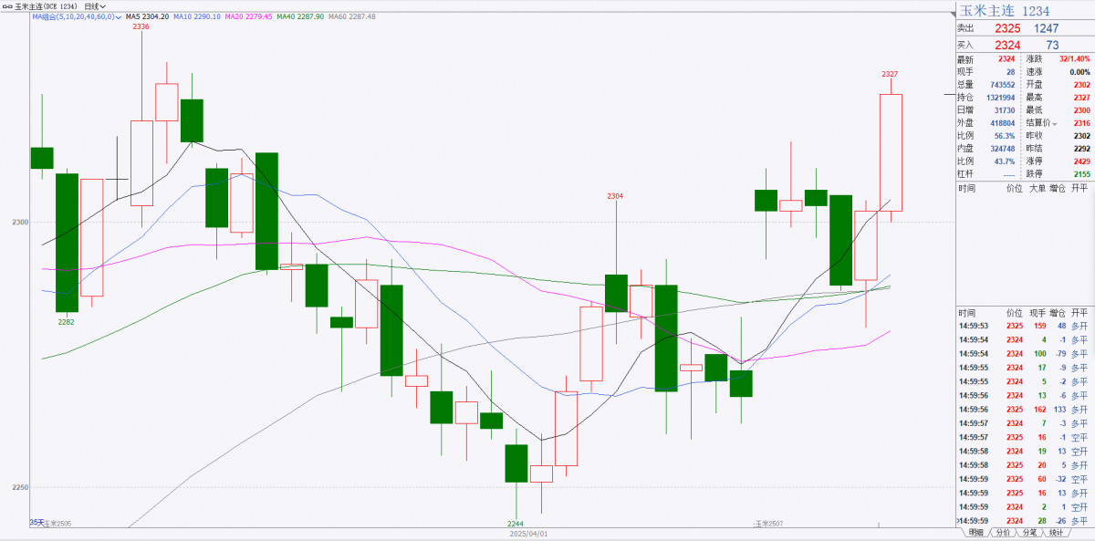 近期玉米盘面经历冲高回落,连续两周下跌,但本周止跌回升、快速反弹,新晋主力2507合约大幅收复失地。周一主力合约低开高走,最低下探 2280元,收盘2302元,周二继续上行,最高触及2327元,刷新本月主力连续合约新高,较前一日低位反弹四五十点,显示反弹动能强劲。