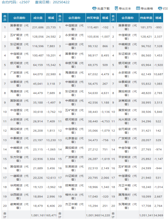 从持仓报告看,C2507 合约当日成交量108万手,较前一日增加16.5万手,多头主力增仓14220手,空头主力增仓34969手。尽管资金大量流入,但空头主力持仓增幅显著,显示偏空力量占据优势,盘面上涨动能或减弱,不排除止涨回落风险。